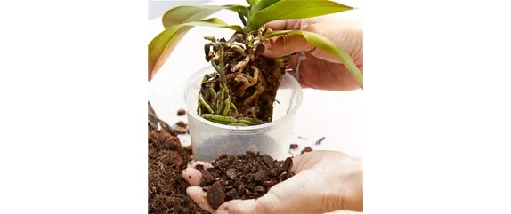 1. Ziehen Sie die Orchidee aus dem Kulturtopf. Drücken Sie ihn etwas in der Hand, falls die Orchidee nicht heraus möchte. Somit lockert sich das Substrat und Sie beschädigen die Wurzeln nicht. Sind die Wurzeln dennoch zu hartnäckig im Topf gefangen, hilft nur das vorsichtige Aufschneiden des Topfes. Achten Sie darauf, dass Sie keine Wurzel verletzen.