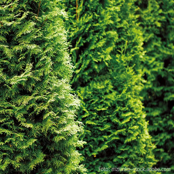 Der Lebensbaum (Thuja) ist eine immergrüne, blickdichte Heckenpflanze. Thujen bieten durch ihr dichtes Wachstum ganzjährig einen perfekten Sichtschutz. Empfehlenswert ist ein feuchter Boden, am besten ein kalkhaltiger, sandiger Lehmboden. Sie passen sich aber auch recht schnell Böden an, die diesem Ideal nicht entsprechen. Die schmalen, säulenförmigen Lebensbäume können als Ersatz für die Echte Zypresse (Cupressus sempervirens – nicht winterhart) gepflanzt werden, was Ihnen schnell ein mediterranes Flair in den Garten zaubert. Pro Jahr sollten Sie zwei Rückschnitte vornehmen. Der erste Schnitt erfolgt im Frühsommer, nachdem sich die neuen Triebe voll entwickelt haben. Der zweite Schnitt sollte Ende August sein, wenn das Wachstum sich bereits verlangsamt hat. Je öfter Sie schneiden, desto dichter und buschiger wird Ihre Hecke. Im Frühjahr empfiehlt sich eine Kompostdüngung, da sich sonst bei fehlenden Nährstoffen die Blattspitzen braun färben können.