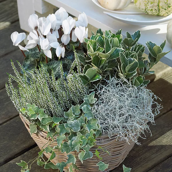 Zum Saisonausklang kann die Farbkraft des Herbstlaubes mit prächtigen Spätblühern in warmen Purpur- und Violett-Tönen wie Schein-Sonnenhut (Echinacea), Aster (Aster) und Chrysantheme (Chrysanthemum) intensiviert werden. Mit dem Hornveilchen (Viola cornuta) setzen Sie auch im Herbst farbenfrohe Blütentupfer. Dank unzähliger Züchtungen gibt es eine große Farb- und Formvielfalt. Passende Leuchtkraft bringen hier Farben wie Rot, Pink, Purpur und Violett. Ein besonderer Hingucker in prächtigem Violett ist der Zierkohl (Brassica). Er bildet kompakte Köpfe mit glatten, gewellten oder krausen Blättern, je nach Sorte. Seine Farbe leuchtet besonders intensiv, je kühler es wird. Herbstliches Flair verbreitet ein Potpourri aus Zierkohl, Erika (Erica) und Alpenveilchen (Cyclamen), das noch mit Zierk¸rbis und einer schönen Laterne dekoriert werden kann.