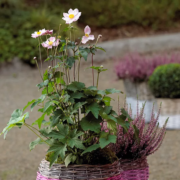 Besonders gut geeignet ist beispielsweise die prächtige Herbstanemone (Anemone japonica) in Rosa mit ihren feinen Blütenblättern als Star-Element für den Garten. Sie ist einfach ein idealer Farbgeber für einen Herbstgarten Ton in Ton und setzt wundervolle Akzente. Gut kombinieren lässt sich zu ihr rot-grüner Himmelsbambus (Nandina domestica), rosarote Besenheide (Calluna) oder dunkelrotes Ziergras wie die Fuchsrote Segge (Carex buchananii). Die farbenfrohe Scheinbeere (Gaultheria procumbens) ist mit ihrem Fruchtschmuck eine ganz besondere Zierde.
