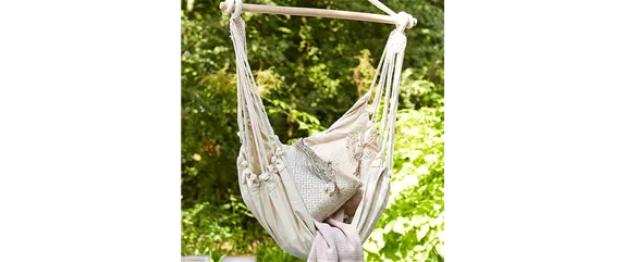Als Sonnenplätzchen und für kleine Faulenzermomente ist ein lässiger Hänge-Stuhl mit stylischen Kissen perfekt zum Träumen und Entspannen.