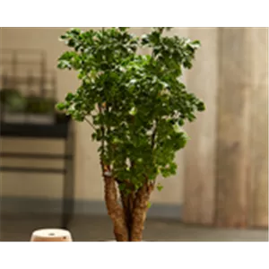 Als dekorativer Baum setzt sich z.B. eine tiefgrüne Glückskastanie (Pachira aquatica) in Szene. Sie ist robust und mag es sonnig bis halbschattig. Zurückhaltender und filigraner ist hingegen eine Fiederaralie (Polyscias). Ihren einzigartigen Look erzeugen die gewellten und gefiederten Blattränder.