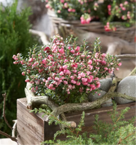 Genauso attraktiv sind die Früchte der Scheinbeere (Gaultheria procumbens), die in den Farben Rot, Rosa oder Weiß auf dem grünen Laub leuchten. „Procumbens“ bedeutet „niederliegend“ – die Pflanze wird maximal 20 cm hoch.