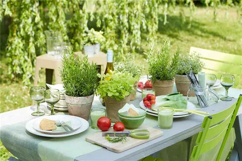Gerade wenn frische Salate auf den Tisch stehen und leckere Fleisch-, Fisch- und Gemüsegerichte serviert werden, sind wohlig duftende Kräuter wie Basilikum, Rosmarin oder Thymian auf dem Tisch die perfekte Deko. Denn sie hübschen den Tisch nicht nur optisch auf, sie sind gleichzeitig auch eine tolle pflückfrische Würze, die dem Grillgut noch den letzten Pfiff geben. Auch eine Karaffe mit aromatisiertem Minzwasser ist dekorativ und erfrischend. Alternativ können auch unterschiedliche Geschmacksrichtungen aus Minze, Zitronenmelisse oder Waldmeister vorbereitet werden. Dafür werden einfach kleine Sträußchen der Kräuter jeweils mit Küchengarn zusammengebunden und mit einer Schlaufe an Holzspießen befestigt. So kann sich jeder Gast sein Wasser ganz nach seinem Geschmack selbst aromatisieren. Abgerundet wird der Kräutertisch noch mit einer selbstgemachten Kräuterbutter als würziger Begleiter für Fleisch-, Fisch- und Gemüsegerichte.