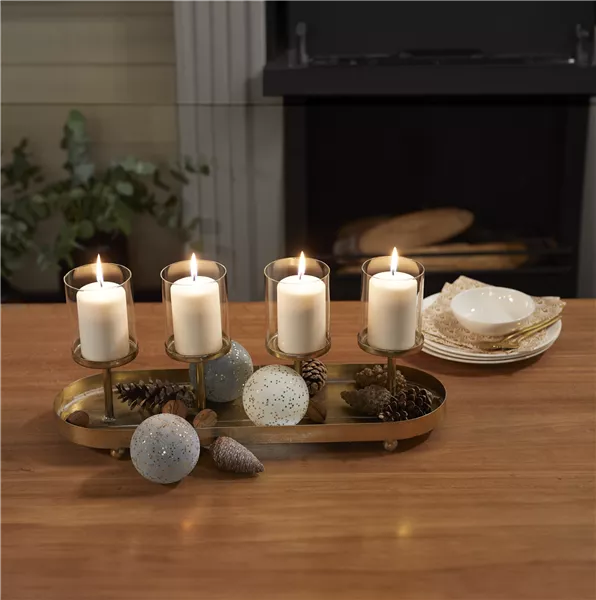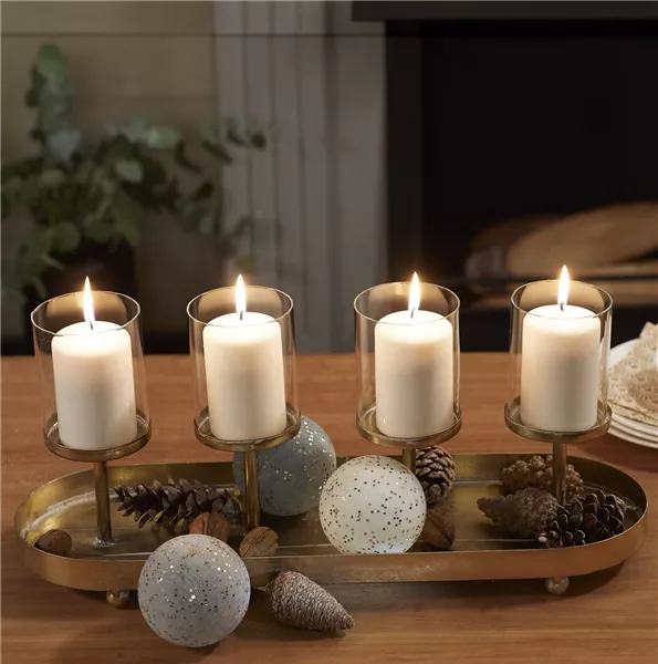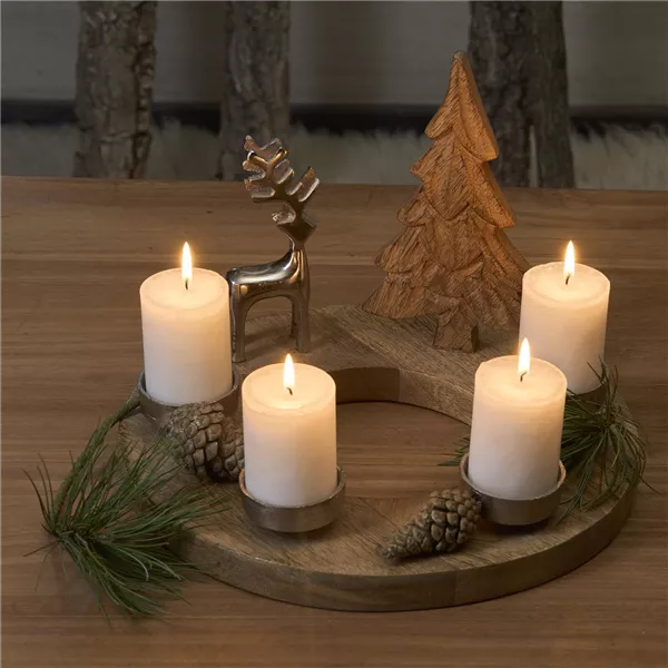 Der längliche Kerzenständer in Champagner-Gold ist ein wahres Highlight auf jeder Festtafel. Seine vier Kerzenhalter schweben förmlich über dem Tablett. Zusätzlich sorgen glitzernde weiße oder graue Weihnachtskugeln aus Glas für einen edlen Touch. Möchten Sie dieses Arrangement farblich und stilistisch etwas aufbrechen, dann sorgen Tannenzapfen für eine natürliche Stimmung. Holz gepaart mit natürlichen und glänzenden Weihnachtselementen – das ist „Soft Metallics“. Mit dem Kerzenkranz aus Holz, auf dem es sich ein silberfarbener Hirsch und ein Bäumchen aus Holz gemütlich gemacht haben, zieht eine verträumte Waldlandschaft bei Ihnen ein.