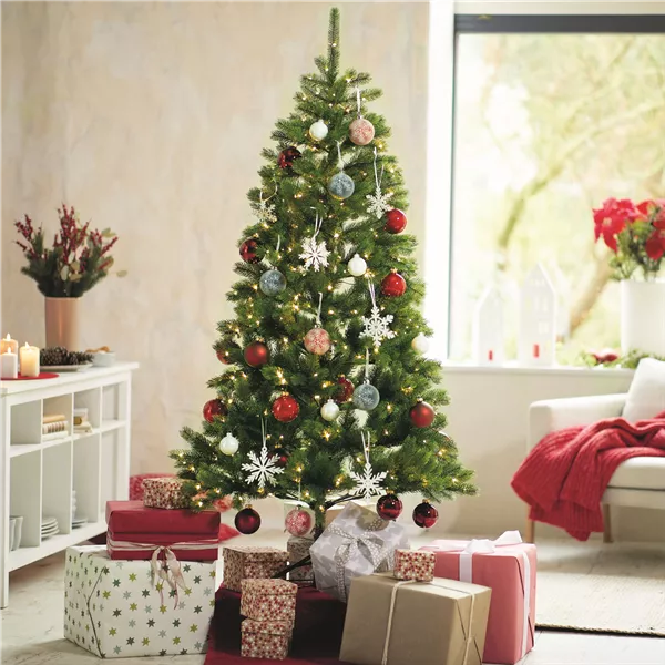 Der LED-Weihnachtsbaum mit einem Standfuß und einer stattlichen Höhe von 180 cm schmückt in der Wohnung jeden Bereich festlich. Er ist schon mit 350 Micro-LEDs ausgestattet und findet jedes Jahr in der Weihnachtszeit seinen Einsatz. Ausgesprochen festlich wirkt er mit roten oder schwarzen Kugeln, die mit einem beschneiten Muster besonders reizvoll wirken. Transparente Kugeln in Weiß und Rot und weiße Schneeflocken in verschiedenen Formen runden die festliche Dekoration des LED-Weihnachtsbaumes ab.