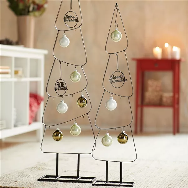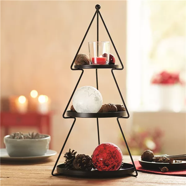 Die zeitlose schwarze Etagere in Form eines Tannenbaumes passt zu jedem Einrichtungsstil. Ihre drei Ebenen können Sie nach Herzenslust dekorieren. Mögen Sie es eher natürlich, dann eignen sich zum Bestücken Nüsse, Zapfen und Tannenzweige. Farben-froher wird es mit vielen bunten Weihnachtskugeln.