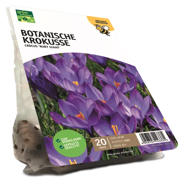 Der Elfenkrokus 'RUBY GIANT' gehört zu den frühesten Frühlingsboten. Seine purpurfarbenen Blüten erscheinen schon im März und bieten Bienen wertvolle Nahrung. Ideal für Beet, Rasen oder Kübel. Höhe: ca. 10 cm.