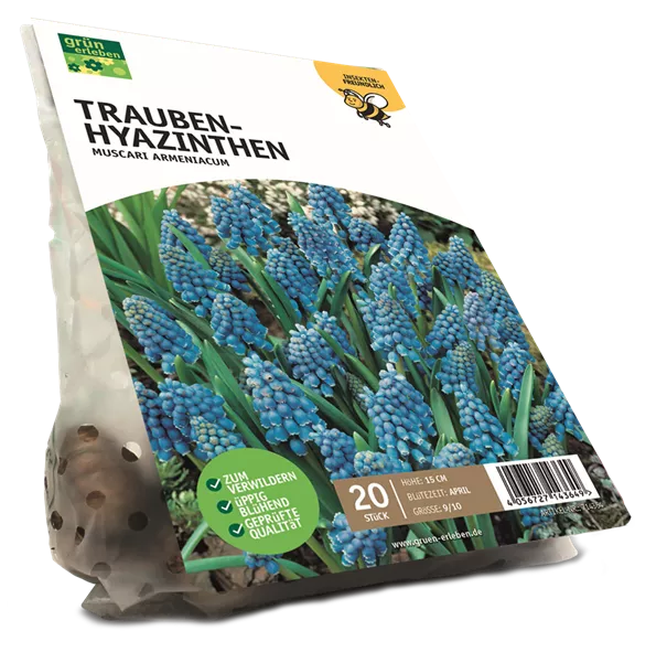 Die blauen Blüten der Traubenhyazinthe erscheinen im April und bilden dichte Farbinseln im Beet. Besonders beliebt ist sie wegen ihrer Pflegeleichtigkeit und Wirkung in großen Gruppen. Außerdem ein echter Bienenmagnet. Höhe: ca. 15 cm.