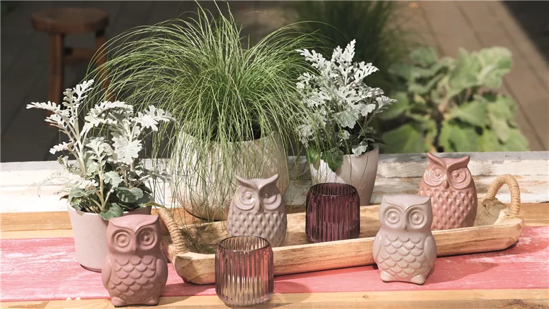 Eulen aus Keramik greifen beliebte Herbstmotive auf und passen mit natürlichen Farben oder beerigen Akzenten stimmungsvoll in den Trend "PURPLE BEAUTY". Diese passen, zusammen mit den WINDLICHTERN aus Glas in verschiedenen Lilatönen, wunderbar auf das Tablett aus Paulowniaholz. Durch seine zwei Henkel lässt sich dieses Dekoobjekt immer dort platzieren, wo Sie es gerade möchten.