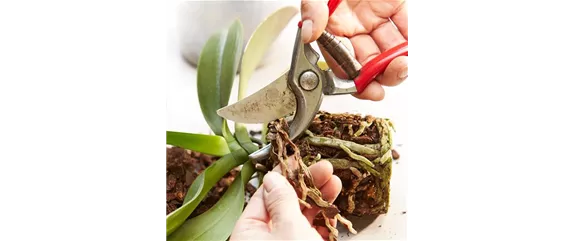 • Orchidee aus ihrem Kulturtopf ziehen, ggf. den Topf in der Hand etwas drücken,